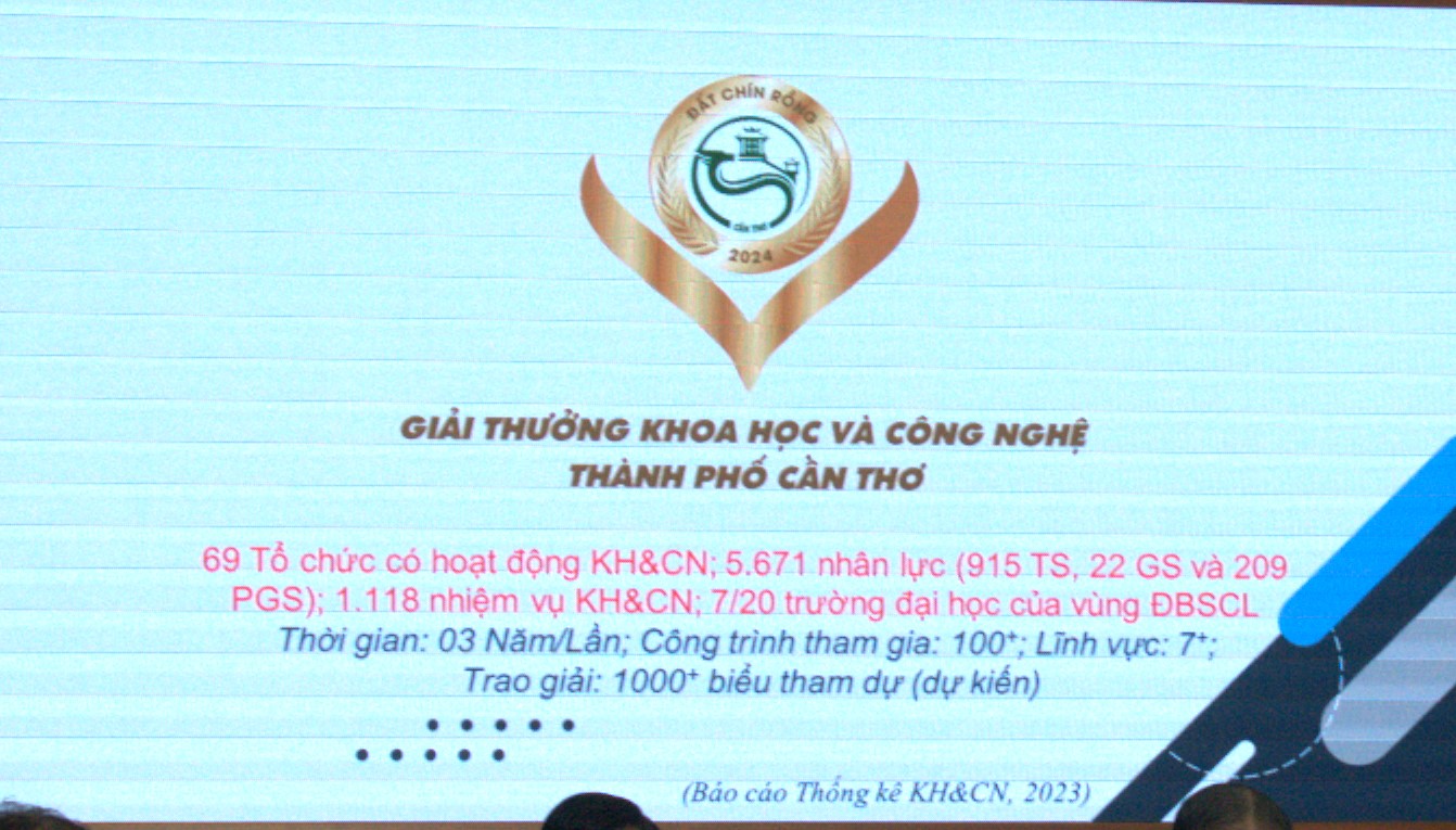Thông tin về giải thưởng, Giám đốc Trung tâm Thông tin KH&CN Cần Thơ cho biết, thành phố Cần Thơ hiện có 69 tổ chức có hoạt động KH&CN gồm DN KH&CN, khoảng 5671 nhân lực KH&CN, trong đó có 915 Tiến sĩ, 22 Giáo sư, 209 Phó Giáo sư; 1.118 nhiệm vụ KH&CN và 7/20 trường Đại học của vùng ĐBSCL. Đây là nguồn nhân lực KH&CN quan trọng có thể tham gia giải, là tiền đề cơ sở để việc tổ chức giải thành công.