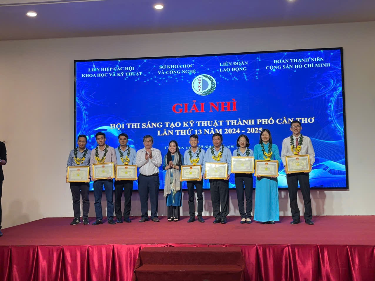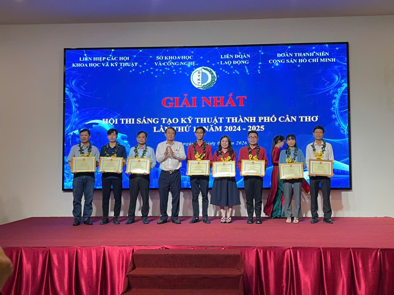Sáng ngày 20/01/2025, tại Hội trường Khách sạn TTC thành phố Cần Thơ đã diễn ra buổi lễ tổng kết và trao giải Hội thi Sáng tạo Kỹ thuật TP. Cần Thơ lần thứ 13 năm 2024 – 2025 (gọi tắt là Hội thi). Buổi lễ vinh dự được đón tiếp ông Nguyễn Văn khởi, Thành ủy viên, Phó Chủ tịch UBND TP. Cần Thơ, các nguyên lãnh đạo, lãnh đạo Liên hiệp Hội, lãnh đạo các Sở, ban, ngành, các nhà khoa học, các tác giả, nhóm tác giả, phóng viên báo, đài đến dự và đưa tin…